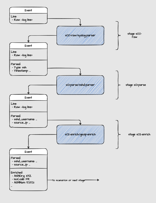 Parsers are organized into stages to allow pipelines and branching in parsing. An event can go to the next stage if at least one parser in the given stage parsed it successfully while having onsuccess set to next_stage. Otherwise, the event is considered unparsed and will exit the pipeline (and be discarded):