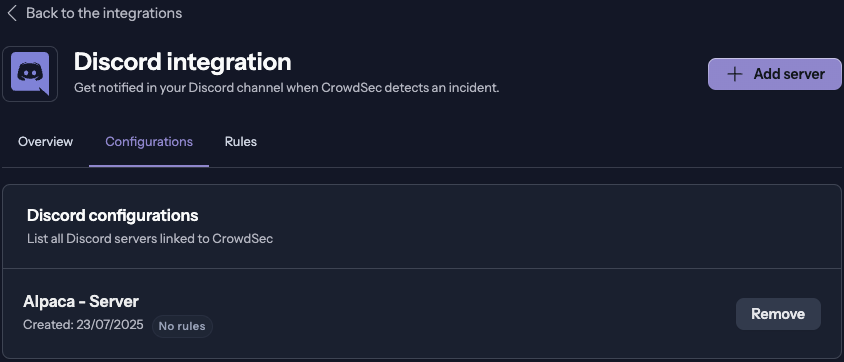 - In the CrowdSec Console, navigate to Settings > Integrations and then select Configure in the Discord row.